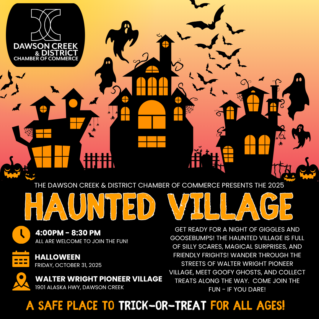Get ready for a night of giggles and goosebumps! the Haunted Village is full of silly scares, magical surprises, and friendly frights! Wander through the streets of walter wright pioneer village, meet goofy ghosts, and collect treats along the way.